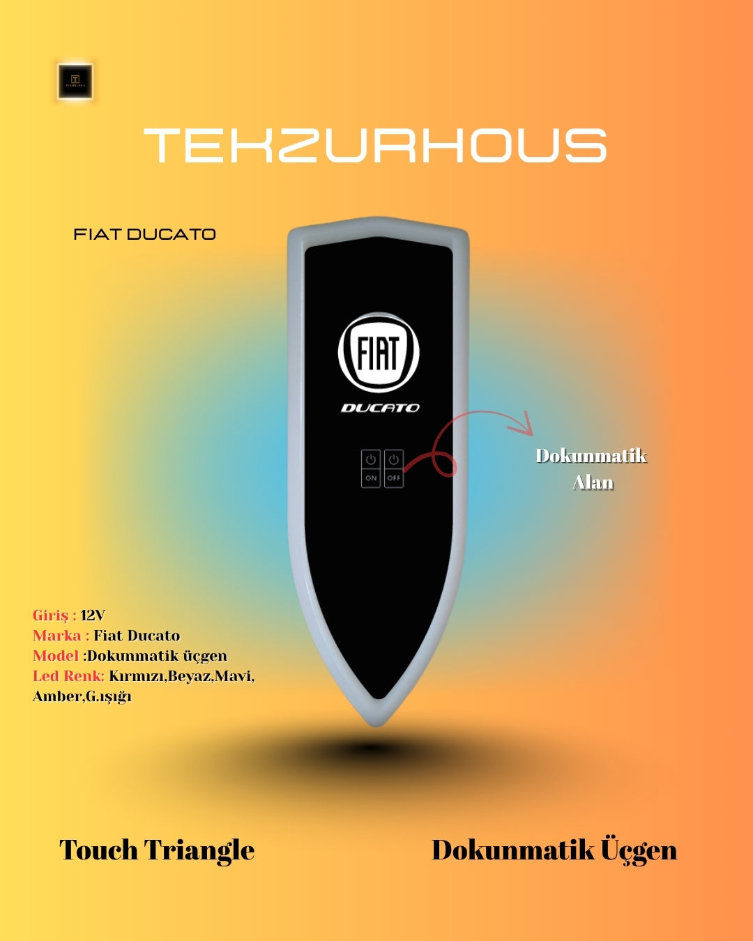 TEKZURHOUS’un VIP araç içi aydınlatma koleksiyonundaki Dokunmatik Üçgen (Touch Triangle), Fiat uyumlu şık gövdesi ve tek dokunuşla çalışan kontrol yüzeyiyle araç iç mekânına lüks, konfor ve teknoloji katar.